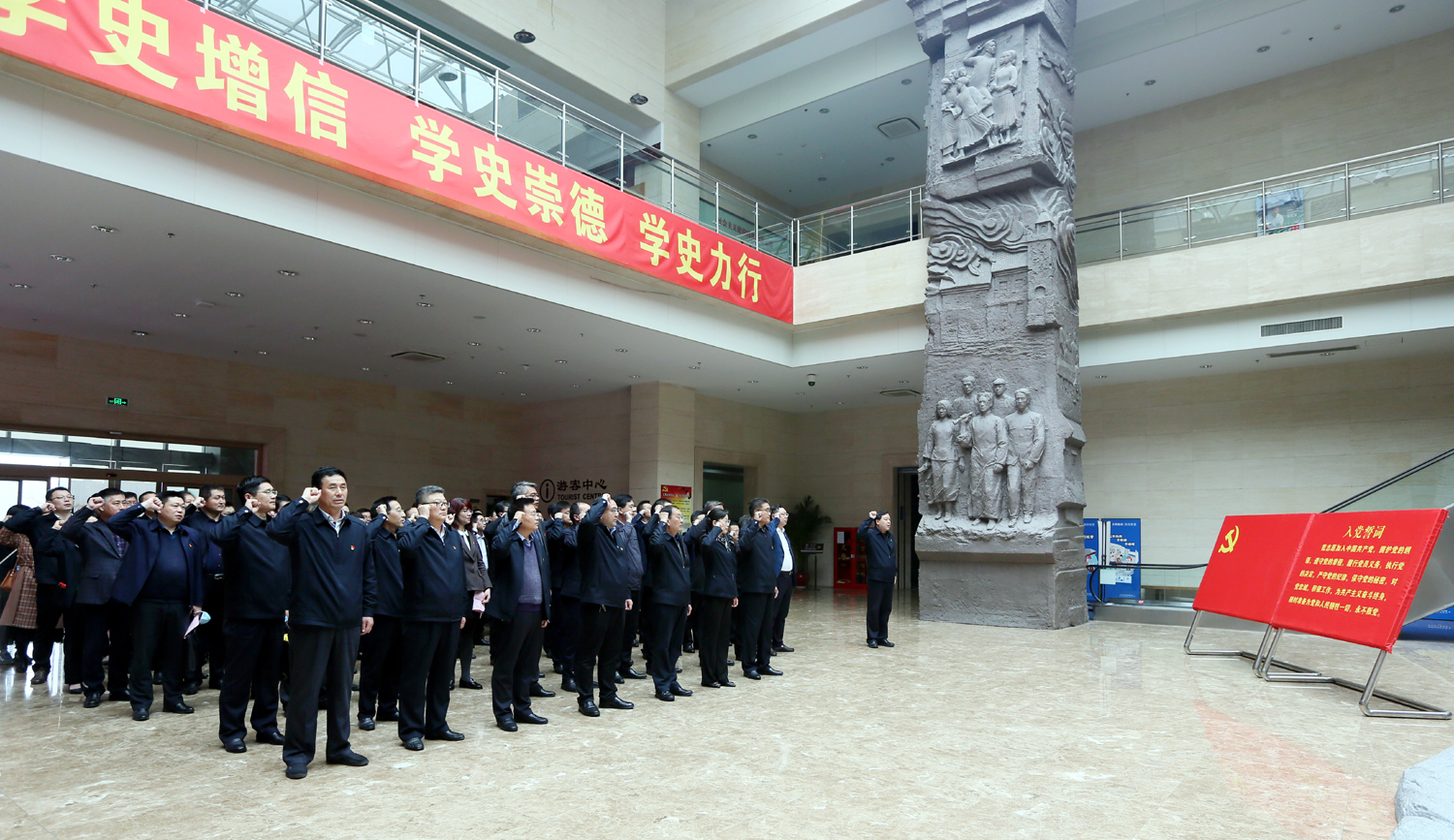 4月22日下午,集團(tuán)公司黨委在市革命紀(jì)念館舉辦“學(xué)史明理守初心、砥礪奮進(jìn)擔(dān)使命”黨性教育實(shí)境課堂。集團(tuán)黨委班子成員,各單位黨建、紀(jì)檢、工會(huì)分管領(lǐng)導(dǎo)、黨群工作部(學(xué)教辦)負(fù)責(zé)人,集團(tuán)總部助理以上管理人員80余人參加。 走進(jìn)市革命紀(jì)念館,在鮮紅的黨旗下,全體黨員舉起右拳,重溫入黨誓詞,鏗鏘有力的誓詞,進(jìn)一步激發(fā)黨員干部牢記黨的初心和使命。在紀(jì)念館展室,大家認(rèn)真看、仔細(xì)聽,通過歷史文獻(xiàn)、革命文物、新聞圖片和視頻資料,真切感受到中國共產(chǎn)黨領(lǐng)導(dǎo)海屬地區(qū)人民在五四運(yùn)動(dòng)、土地革命、抗日戰(zhàn)爭、解放戰(zhàn)爭時(shí)期血與火的革命斗爭史。