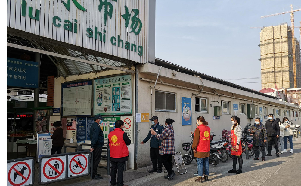 農(nóng)貿(mào)市場是海州區(qū)農(nóng)副產(chǎn)品的重要集散地,在疫情期間,市場人員密集、結(jié)構(gòu)復(fù)雜、進(jìn)出流量大,防控難度極大。為確保市場運(yùn)行有序、疫情防控到位,市場管理人員每日早早到崗,牢牢堅守在防控一線陣地上,利用LED、口頭宣教、張貼公告等多種形式,積極宣傳新型冠狀病毒防護(hù)知識,嚴(yán)格按照疫情防控要求落實(shí)測溫、掃碼、戴口罩、消毒等各項(xiàng)措施,有力保障進(jìn)場群眾及商戶人身安全。