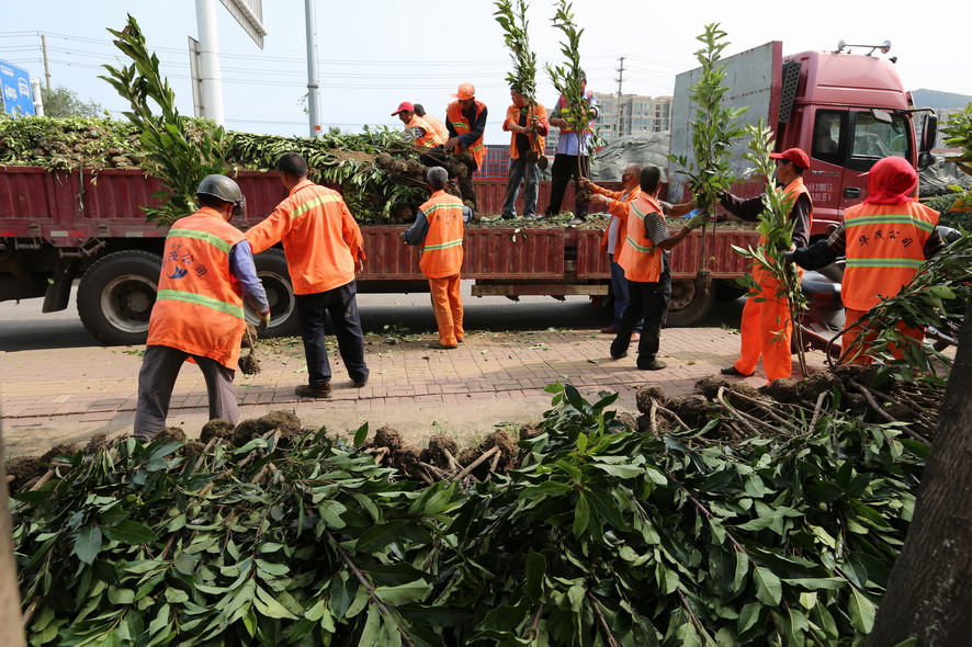 新光路鐵路橋至港城大道段南側綠化帶,因為人為踩踏、車輛碾壓導致綠化斑禿損壞嚴重,為盡快恢復綠化原貌,改善市容市貌。8月18日,裕升、裕欣養(yǎng)護公司組織80多名綠化工,從早上6點一直干到下午6點,卸苗、運苗、挖坑、插苗,烈日酷暑下奮戰(zhàn)一整天,中午在樹陰下吃點盒飯,喝點礦泉水,繼續(xù)工作,橘黃色工作被汗水浸透、被烈日烤干,這樣有好幾個來回?!敖裉煳覀円谶@片綠化補植紅葉石楠、金森女貞等模紋小苗1萬余株,紅葉石楠球等灌木110株,有效改善該路段綠化植被,提升城市形象,我們還要在黃海續(xù)道補植草坪近30000平方,在這條1000多米長的路段,有車輛維修點50多家,車輛出入,對路邊綠化帶傷害非常大,這一路段也是環(huán)衛(wèi)整治長期存在的‘老大難’,這次,在開發(fā)區(qū)行政執(zhí)法部門的配合下,我們要重新種植草坪,對這一‘老大難’路段植被進行恢復,另外德蘭南路、東路補植苗木近80萬元的綠化工程也已開工上土整土,接著要栽苗,根據(jù)開發(fā)區(qū)創(chuàng)衛(wèi)部署要求,上述這些事情必須在8月底完成,所以說時間相當緊,職工們都冒著高溫,加班加點搶進度。”公司副總經(jīng)理郁宏峰說。