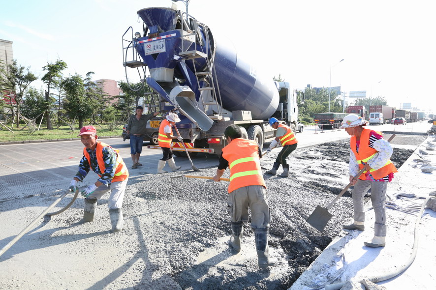 在大港路“新光路至零公里”路段,筆者在水泥路上看到一塊塊被切割成方方正正的凹面,四周都架好防護欄等安全防護設施,在華東城北門偏東不遠處,一臺挖掘機的鏟斗被換上沖擊破碎錘,正在一大塊破損的水泥路面沖擊破碎作業(yè),“嗒嗒嗒”的沖擊聲十分震耳。在與現(xiàn)場作業(yè)的盛達市政公司市政維修項目部副主任史如勤交流中得知,該路段是附近集團箱基站進出港口集裝箱車輛的重要通道,每天有好幾百輛集裝箱車輛進出,水泥路面不堪重負,損壞比較嚴重,根據(jù)開發(fā)區(qū)創(chuàng)衛(wèi)工作要求,由他們對該路段破損處進行局面分割維修,整個路段維修面積達到5000多平方,為保證道路使用通行,采取半幅維修、邊破碎邊澆灌的方式,保證施工進度,現(xiàn)正在維修北側路面,整個路面維修計劃在8月底完成?!耙驗閯?chuàng)衛(wèi),我們下一步還要對轄區(qū)內的破損、歪到的路牙石進行維修扶正,242路段瀝青破損路面維護,還要開通四處道口,而現(xiàn)在事多人少,人手比較緊張,我們周六周日都沒有休息,就是想把創(chuàng)衛(wèi)工作任務一項一項地及時完成,決不能拖創(chuàng)衛(wèi)工作后腿?!彼呎f邊用肩上的毛巾擦著額頭上的汗水。