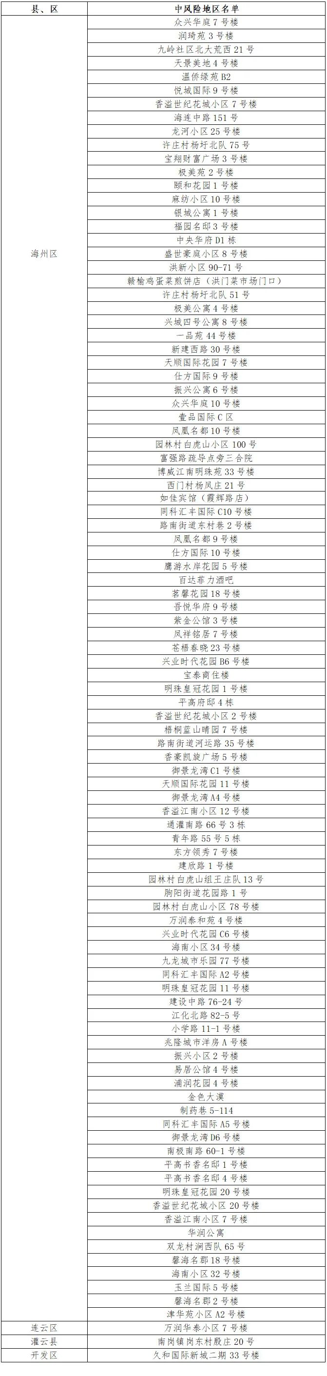 根據(jù)國務(wù)院聯(lián)防聯(lián)控機(jī)制有關(guān)規(guī)定,經(jīng)綜合評估研判,市指揮部決定,自發(fā)布之日起,將海州區(qū)明珠皇冠花園20號樓、香溢世紀(jì)花城小區(qū)20號樓、香溢江南小區(qū)7號樓、華潤公寓、雙龍村澗西隊(duì)65號、馨海名郡18號樓、海南小區(qū)32號樓、玉蘭國際5號樓、馨海名郡2號樓、津華苑小區(qū)A2號樓調(diào)整為中風(fēng)險(xiǎn)地區(qū)。 其他地區(qū)風(fēng)險(xiǎn)等級不變。調(diào)整后全市現(xiàn)有99個(gè)中風(fēng)險(xiǎn)地區(qū)。 連云港市突發(fā)新冠肺炎疫情 應(yīng)急處置指揮部辦公室 2022年3月14日 連云港市中風(fēng)險(xiǎn)地區(qū)(99個(gè)) (2022年3月14日)