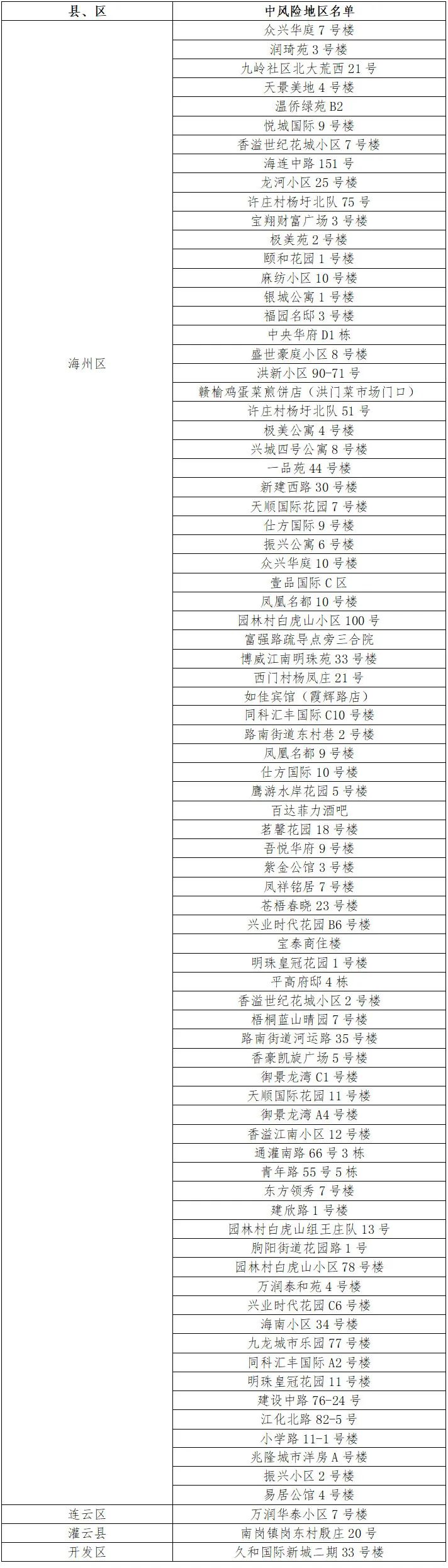 根據(jù)國務院聯(lián)防聯(lián)控機制有關規(guī)定,經(jīng)綜合評估研判,市指揮部決定,自發(fā)布之日起,將海州區(qū)園林村白虎山組王莊隊13號、朐陽街道花園路1號、園林村白虎山小區(qū)78號樓、萬潤泰和苑4號樓、興業(yè)時代花園C6號樓、海南小區(qū)34號樓、九龍城市樂園77號樓、同科匯豐國際A2號樓、明珠皇冠花園11號樓、建設中路76-24號、江化北路82-5號、小學路11-1號樓、兆隆城市洋房A號樓、振興小區(qū)2號樓、易居公館4號樓調整為中風險地區(qū)。 其他地區(qū)風險等級不變。調整后全市現(xiàn)有81個中風險地區(qū)。
