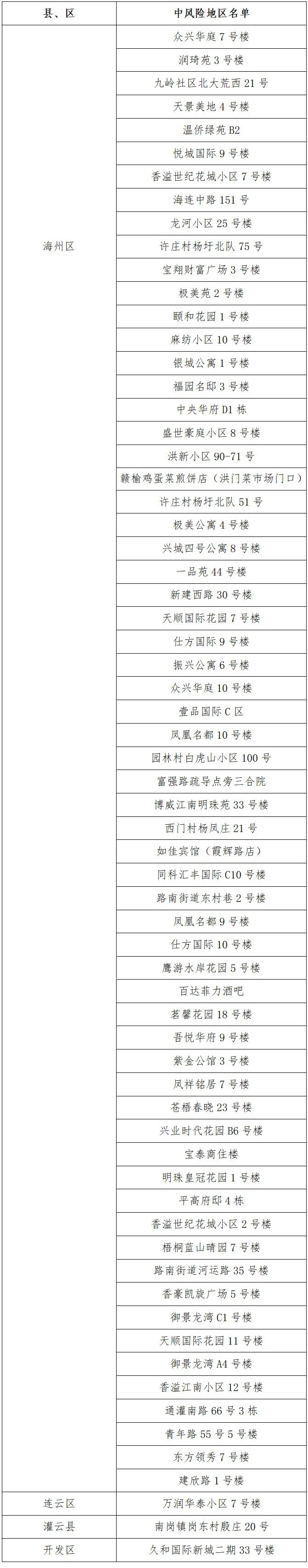 根據(jù)國務(wù)院聯(lián)防聯(lián)控機(jī)制有關(guān)規(guī)定,經(jīng)綜合評估研判,市指揮部決定,自發(fā)布之日起,將海州區(qū)茗馨花園18號樓、吾悅?cè)A府9號樓、紫金公館3號樓、鳳祥銘居7號樓、蒼梧春曉23號樓、興業(yè)時代花園B6號樓、寶泰商住樓、明珠皇冠花園1號樓、平高府邸4棟、香溢世紀(jì)花城小區(qū)2號樓、梧桐藍(lán)山晴園7號樓、路南街道河運(yùn)路35號樓、香豪凱旋廣場5號樓、御景龍灣C1號樓、天順國際花園11號樓、御景龍灣A4號樓、香溢江南小區(qū)12號樓、通灌南路66號3棟、青年路55號5號樓、東方領(lǐng)秀7號樓、建欣路1號樓調(diào)整為中風(fēng)險地區(qū)。其他地區(qū)風(fēng)險等級不變。調(diào)整后全市現(xiàn)有66個中風(fēng)險地區(qū)。