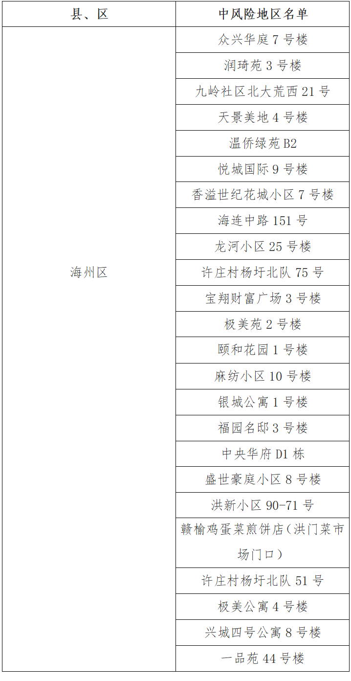 根據(jù)國(guó)務(wù)院聯(lián)防聯(lián)控機(jī)制有關(guān)規(guī)定,經(jīng)綜合評(píng)估研判,市指揮部決定,自發(fā)布之日起,將頤和花園1號(hào)樓、麻紡小區(qū)10號(hào)樓、銀城公寓1號(hào)樓、福園名邸3號(hào)樓、中央華府D1棟、盛世豪庭小區(qū)8號(hào)樓、洪新小區(qū)90-71號(hào)、贛榆雞蛋菜煎餅店(洪門菜市場(chǎng)門口)、許莊村楊圩北隊(duì)51號(hào)、極美公寓4號(hào)樓、興城四號(hào)公寓8號(hào)樓、一品苑44號(hào)樓調(diào)整為中風(fēng)險(xiǎn)地區(qū)。其他地區(qū)風(fēng)險(xiǎn)等級(jí)不變。調(diào)整后全市現(xiàn)有24個(gè)中風(fēng)險(xiǎn)地區(qū)。