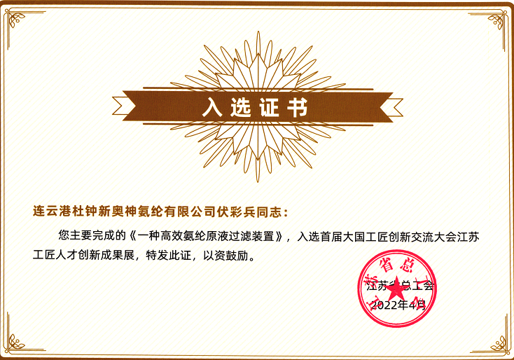 近日,全國(guó)總工會(huì)主辦首屆大國(guó)工匠創(chuàng)新交流大會(huì),氨綸公司伏彩兵完成的《一種高效氨綸原液過(guò)濾裝置》創(chuàng)新成果入選大國(guó)工匠展,伏彩兵還入選了首屆大國(guó)工匠創(chuàng)新交流大會(huì)江蘇展區(qū)重點(diǎn)展示科創(chuàng)推薦通道。本次大會(huì)以“技能強(qiáng)國(guó),創(chuàng)新有我”為主題,通過(guò)線上線下形式展示以大國(guó)工匠為代表的廣大職工的精湛技能和創(chuàng)新成果,為廣大高技能人才搭建交流平臺(tái)。