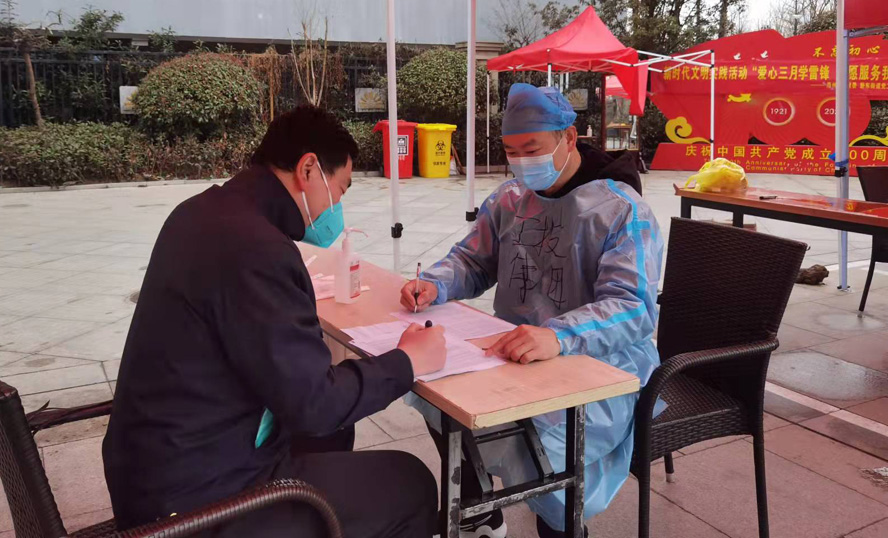 核酸采樣檢測高效完成?!熬用駛冋堊⒁?,咱們小區(qū)黃碼檢測點啟用了,請健康碼為黃碼的居民到這邊排隊,請大家佩戴口罩,有序排隊檢測?!薄敖鸱孔印敝驹刚吣弥群暗?。由于該小區(qū)部分樓棟被列為中風險區(qū)域,部分居民健康碼轉(zhuǎn)為了黃碼,為此,志愿者小分隊協(xié)助社區(qū)開設(shè)了健康碼“黃碼”人員核酸檢測專用采樣點,解決健康碼“黃碼”人員核酸檢測難的問題。他們從早上7點鐘開始一直堅守在核酸檢測一線,直到下午5點多鐘,終于結(jié)束了一天的志愿服務(wù)工作,脫下了防護服“戰(zhàn)袍”,肚子“咕咕”地鬧了起來,這才想起竟十幾個小時沒有喝水、吃飯、上廁所了。