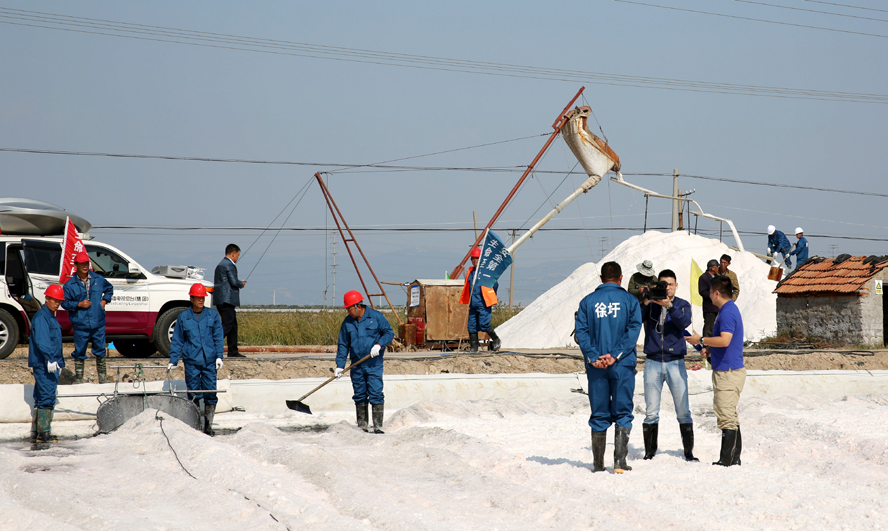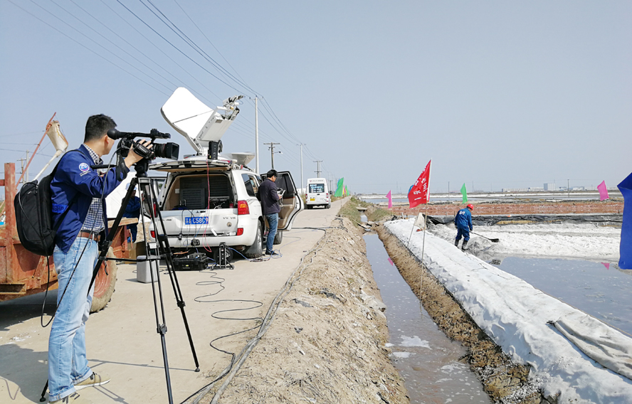 攝制組動用直播車、航拍、信號傳輸+高清攝像機等設(shè)備,工作人員各有分工,同步拍攝鹽田生產(chǎn)、鹽工勞動以及食鹽生產(chǎn)等淮鹽收獲的喜人畫面,記者更是在鏡頭的一路跟拍下,一邊自己動手操作,一邊與現(xiàn)場勞動的鹽工親切交談,向觀眾詳細(xì)解讀生態(tài)淮鹽灘曬生產(chǎn)和食鹽生產(chǎn)的工藝流程,為大家熟悉、了解和保護(hù)淮鹽提供一次直觀的認(rèn)知機會。