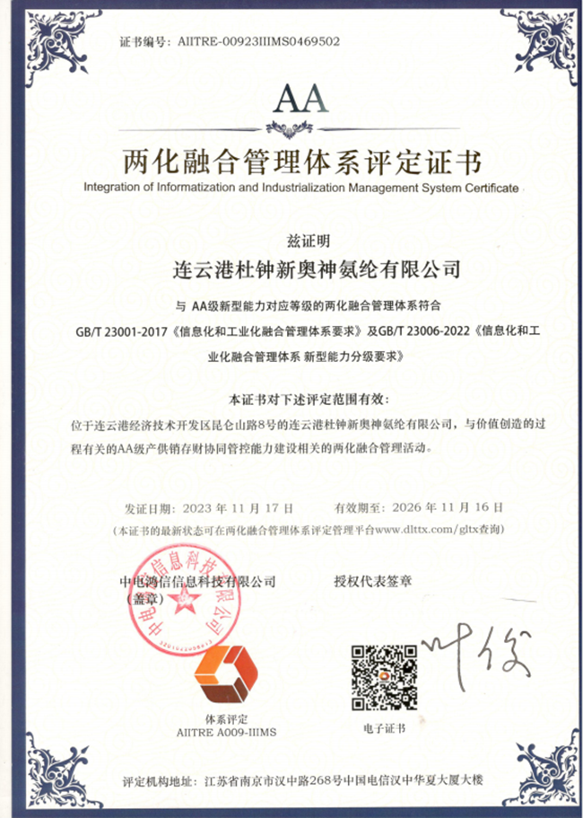 經(jīng)過工信部認(rèn)可的評(píng)定機(jī)構(gòu)的審核,氨綸公司成功獲得了AA級(jí)兩化融合管理體系評(píng)定證書。這一認(rèn)證的取得充分證明了氨綸公司在信息化和工業(yè)化融合管理方面的卓越能力和卓越績(jī)效。