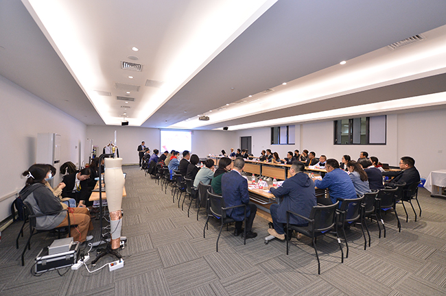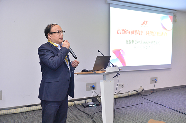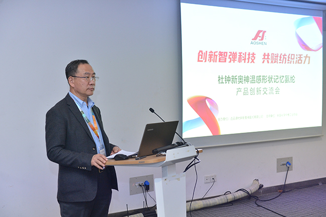 交流會上,杜鐘氨綸研發(fā)部曾登部長就奧神溫感形狀記憶氨綸的開發(fā)背景、產(chǎn)品特性以及應(yīng)用前景作了深入解析。參會嘉賓在對溫感形狀記憶氨綸有了較為清晰的認(rèn)知和了解后,圍繞該產(chǎn)品的功能特點(diǎn)并結(jié)合自身產(chǎn)品開發(fā)方向,展開了一場智慧碰撞,對溫感形狀記憶氨綸的創(chuàng)新應(yīng)用提出了獨(dú)到的建議和暢想。