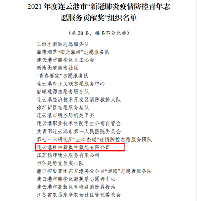 近日,共青團(tuán)連云港市委員會(huì)公布2021年度全市青年志愿者行動(dòng)暨新冠肺炎疫情防控青年志愿服務(wù)貢獻(xiàn)獎(jiǎng)評(píng)選表彰結(jié)果,連云港杜鐘新奧神氨綸有限公司志愿者服務(wù)隊(duì)榜上有名,榮獲2021年度連云港市“新冠肺炎疫情防控青年志愿服務(wù)貢獻(xiàn)獎(jiǎng)”組織榮譽(yù)稱號(hào)。