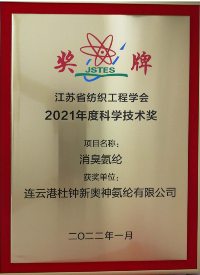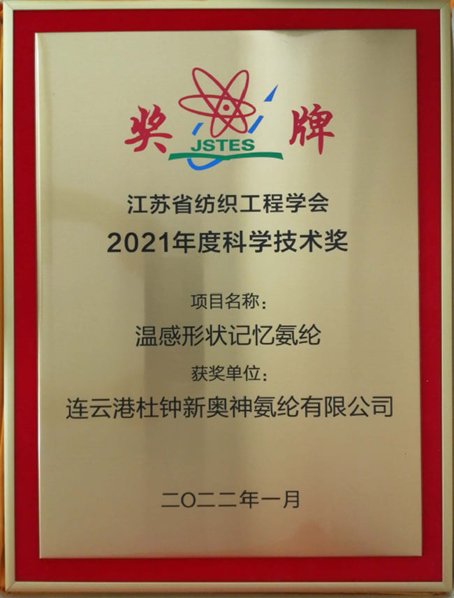 日前,杜鐘氨綸公司2021年申請參評的兩項(xiàng)自主研發(fā)新產(chǎn)品《溫感形狀記憶氨綸》、《消臭氨綸》被授予江蘇省紡織工程學(xué)會2021年度科學(xué)技術(shù)獎(jiǎng)。
