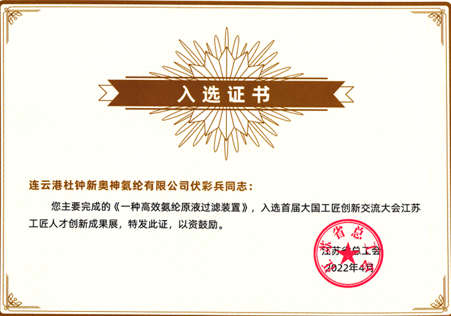 根據(jù)省、市總工會部署要求,氨綸公司積極組織工匠人才參展。經(jīng)評選,公司伏彩兵主要完成的《一種高效氨綸原液過濾裝置》創(chuàng)新成果入選大國工匠展,伏彩兵還入選了首屆大國工匠創(chuàng)新交流大會江蘇展區(qū)重點展示科創(chuàng)推薦通道。