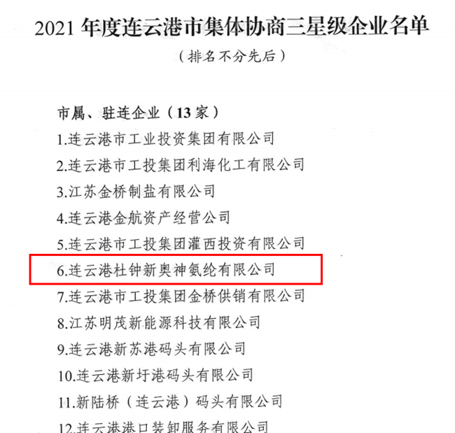 日前,從市協(xié)調(diào)勞動(dòng)關(guān)系三方委員會辦公室傳來喜訊,2021年度連云港市集體協(xié)商三星級企業(yè)評定結(jié)果新鮮出爐,杜鐘氨綸公司獲評市級“集體協(xié)商三星級企業(yè)”。