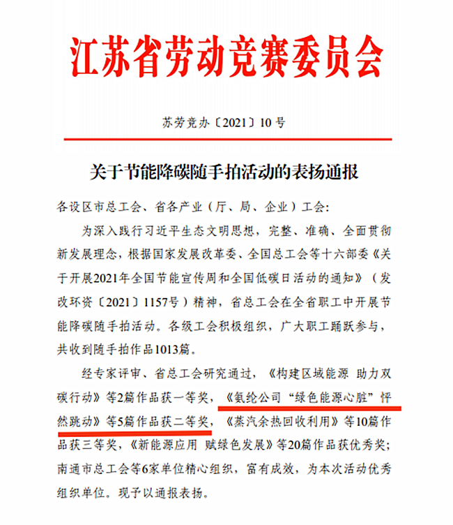日前,江蘇省總工會(huì)在全省職工中開展節(jié)能降碳隨手拍活動(dòng)評(píng)選結(jié)果正式公布,杜鐘氨綸公司《氨綸公司“綠色能源心臟”怦然跳動(dòng)》榮獲二等獎(jiǎng)。黨群工作部 韓奇