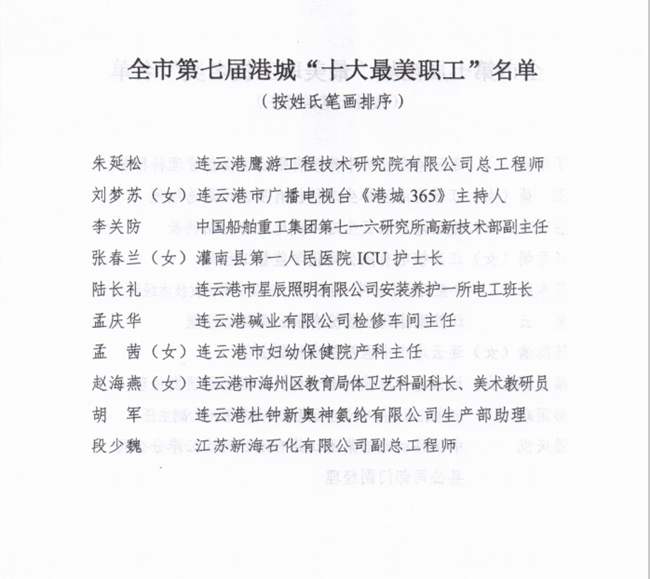 日前,連云港市委宣傳部、市總工會在全市開展的第七屆“十大最美職工”評選活動,公司生產(chǎn)二部助理胡軍榜上有名。