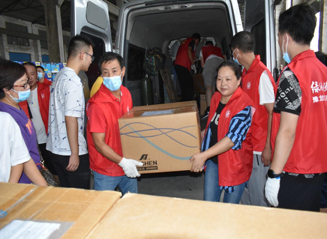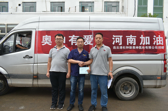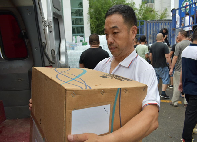 中午十二點,第一批物資捐贈后,顧不得吃飯我們就奔赴第二個捐贈點滎陽紅十字會。路上交警為我們耐心引導,仔細說明哪里有塌方,哪里可以通行,臨行還貼心的留下微信號碼,囑咐道:在鄭州遇到困難隨時聯(lián)系。到達后不出意外的開始排隊,看著其他志愿者熱火朝天的忙碌,我和同行的小孫心里很不是滋味:我們千里迢迢帶著集團公司黨委和公司黨委的重托和港城人民的美好祝愿來到災區(qū),我們不僅僅是要來捐贈物資,是不是也該做點什么?幾經(jīng)請示,紅會組織人員終于答應了我們的請求,同意我們作為臨時志愿者加入搬運捐贈物資的隊伍。雖然大家已經(jīng)兩天沒合眼了,但是當穿上志愿者馬甲后,我們頓時精神煥發(fā),立刻投入到緊張有序的搬運工作中。托舉起每一件來自祖國各地捐贈物資,心里都暖暖的,因為這里充滿了來自大江南北人們深深的祝福,激動的心情難以言表。此刻,我們對“眾志成城”有了更深刻的理解。