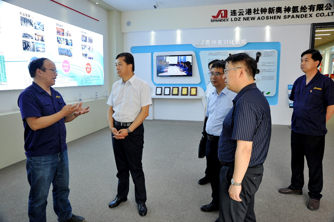 賈伊生常委領(lǐng)導(dǎo)一行先后參觀了公司展廳、八期生產(chǎn)線、自動(dòng)包裝線。公司總經(jīng)理張斌向來(lái)訪領(lǐng)導(dǎo)詳細(xì)介紹了氨綸公司的發(fā)展歷程、氨綸的市場(chǎng)行情以及氨綸纖維的應(yīng)用。交流中,張總重點(diǎn)介紹了公司超強(qiáng)的技術(shù)研發(fā)能力,近年來(lái)陸續(xù)推出差別化氨綸產(chǎn)品,連續(xù)五年入選“中國(guó)纖維流行趨勢(shì)”,以及公司與俏佳人、浪莎、厚木等國(guó)內(nèi)外知名品牌開(kāi)展長(zhǎng)期合作,并利用現(xiàn)有資源開(kāi)發(fā)后道產(chǎn)品的有益嘗試。賈常委一行對(duì)氨綸的生產(chǎn)工藝、技術(shù)要求、應(yīng)用領(lǐng)域等進(jìn)行了深入了解。