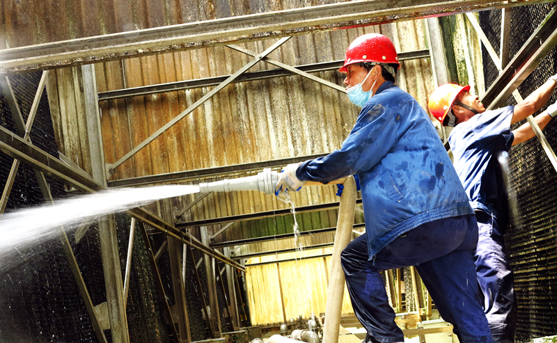 近期,最高氣溫達到了36℃!公用工程部一直密切關注近一周的天氣預報,利用連續(xù)高溫天氣回調之際,迅速組織相關清洗人員,利用一天時間緊急清洗八期冷卻塔,將附著在填料上藻狀和絮狀物及塔底淤泥等徹底清理干凈,從而保證冷卻塔通風量,使八期動力設備得以在高溫環(huán)境下安全運行,接受“烤驗”。
