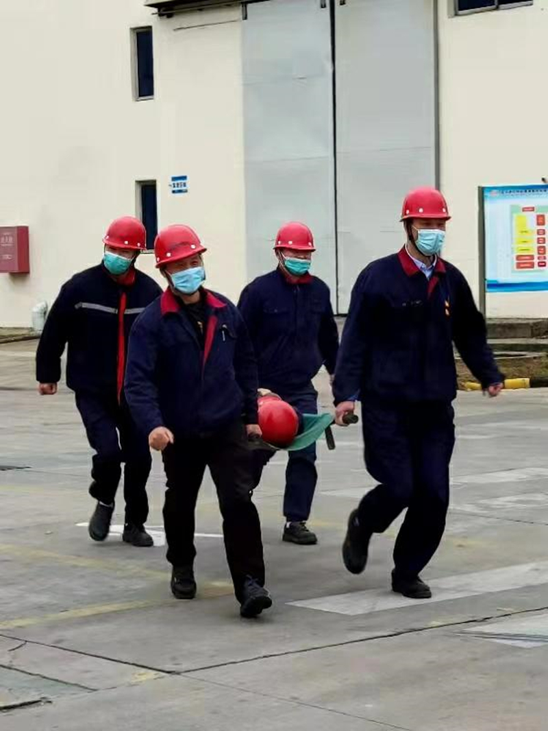 下午14:00消防控制中心檢測(cè)到八期胺房可燃?xì)怏w探測(cè)器報(bào)警,立即通知當(dāng)班操作人員。經(jīng)現(xiàn)場(chǎng)查看確認(rèn)為胺房化學(xué)品發(fā)生泄漏,并有人員暈倒,立即匯報(bào)。公司領(lǐng)導(dǎo)啟動(dòng)應(yīng)急預(yù)案,要求立即開(kāi)展搶險(xiǎn)救援,ERT人員迅速集結(jié)。在現(xiàn)場(chǎng)總指揮的命令下,警戒組、疏散組、救援組、現(xiàn)場(chǎng)處置組各司其職。隔離現(xiàn)場(chǎng)、撤離相關(guān)區(qū)域人員、轉(zhuǎn)移傷員,現(xiàn)場(chǎng)處置組身穿防化服、佩戴防毒面具、攜帶防爆工具進(jìn)入現(xiàn)場(chǎng),對(duì)泄漏點(diǎn)進(jìn)行緊急處置。經(jīng)過(guò)緊張?zhí)幚?,事故險(xiǎn)情得到控制,現(xiàn)場(chǎng)大氣環(huán)境與水體檢測(cè)均達(dá)標(biāo),傷者脫離危險(xiǎn),演練達(dá)到了預(yù)期效果。