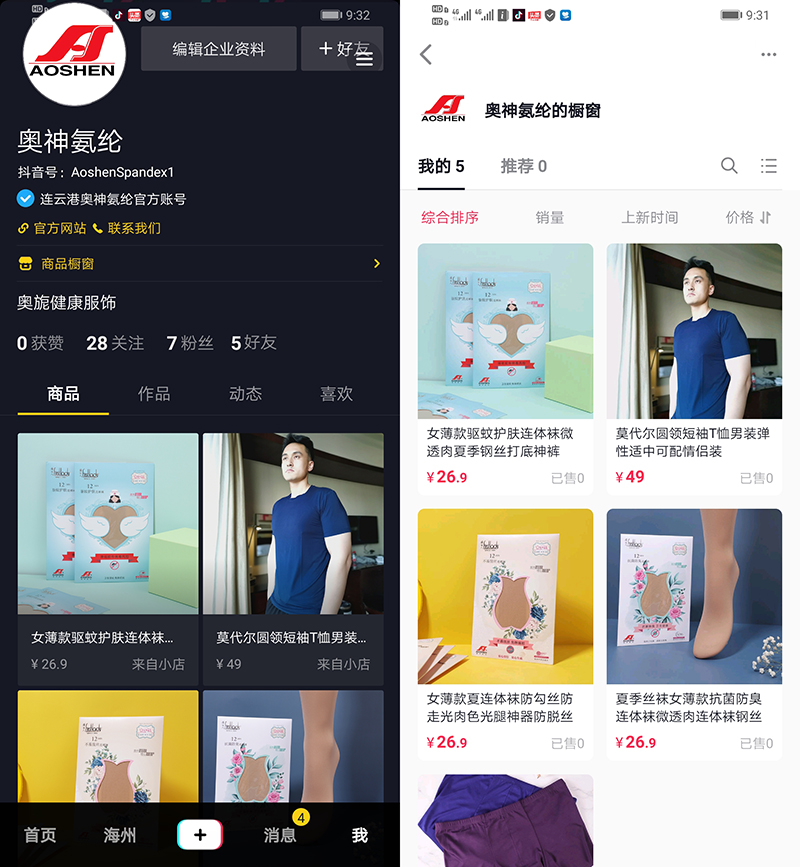 5月20日,氨綸公司經(jīng)過幾個月的緊張籌備,“奧旎服飾”在抖音、淘寶正式上線。這標(biāo)志著氨綸公司正式開啟了電商銷售后道產(chǎn)品的新時代。