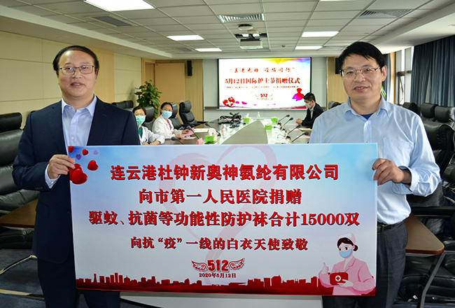 5月12日,連云港杜鐘氨綸有限公司在市總工會(huì)的帶領(lǐng)下來(lái)到連云港市第一人民醫(yī)院開展愛心捐贈(zèng)活動(dòng)。氨綸公司與國(guó)內(nèi)知名襪業(yè)公司俏佳人合作使用奧神專利產(chǎn)品訂制了一批“防脫散襪”、驅(qū)蚊襪、抗菌防臭襪等功能性防護(hù)襪,共計(jì)捐贈(zèng)15000雙。市總工會(huì)副主席、女職委主任秦云;連云港市工業(yè)投資集團(tuán)工會(huì)主席劉承志;市第一人民醫(yī)院副院長(zhǎng)、工會(huì)主席胡蓉,副院長(zhǎng)李明星;連云港杜鐘新奧神氨綸有限公司總經(jīng)理張斌,副總經(jīng)理劉明珠等領(lǐng)導(dǎo)出席捐贈(zèng)儀式。