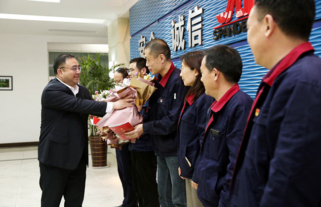 楊董事長進(jìn)基層、到一線,與勞模先進(jìn)面對面交流,傾聽他們的心聲和意見,感謝他們長期以來為企業(yè)發(fā)展作出的貢獻(xiàn),并獻(xiàn)上一束鮮花、送上一封慰問信、發(fā)放一張蛋糕卡、特制一張健康卡、送上一份祝福。