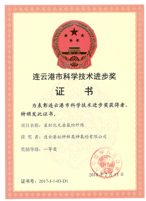 2017年我公司經(jīng)過網(wǎng)上申報,政府公示、專家評審、現(xiàn)場答辯等評審程序,最終公司高新技術(shù)產(chǎn)品《差別化無染氨綸纖維》獲得市政府授予的2017度連云港市科學(xué)技術(shù)進步獎一等獎榮譽稱號。