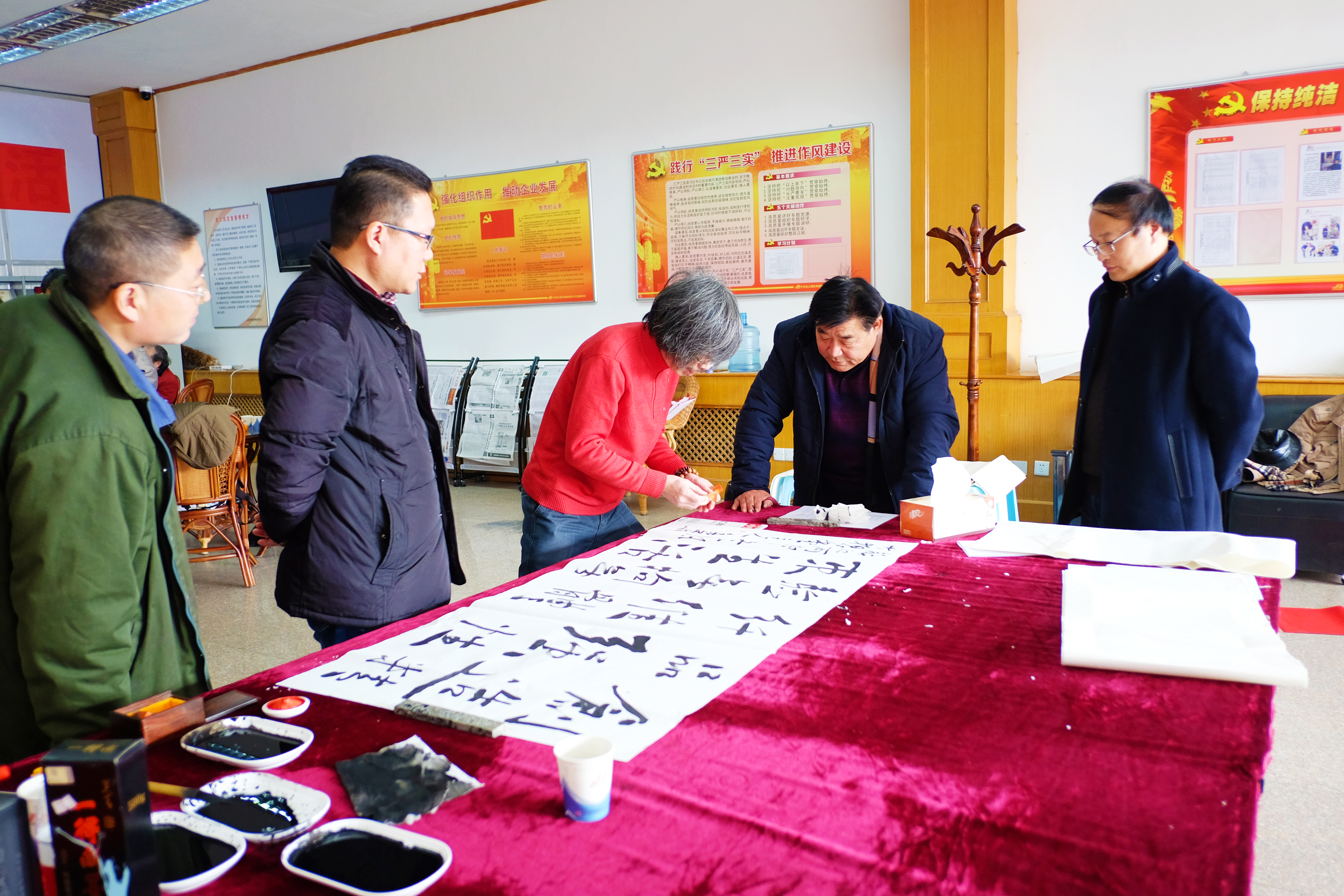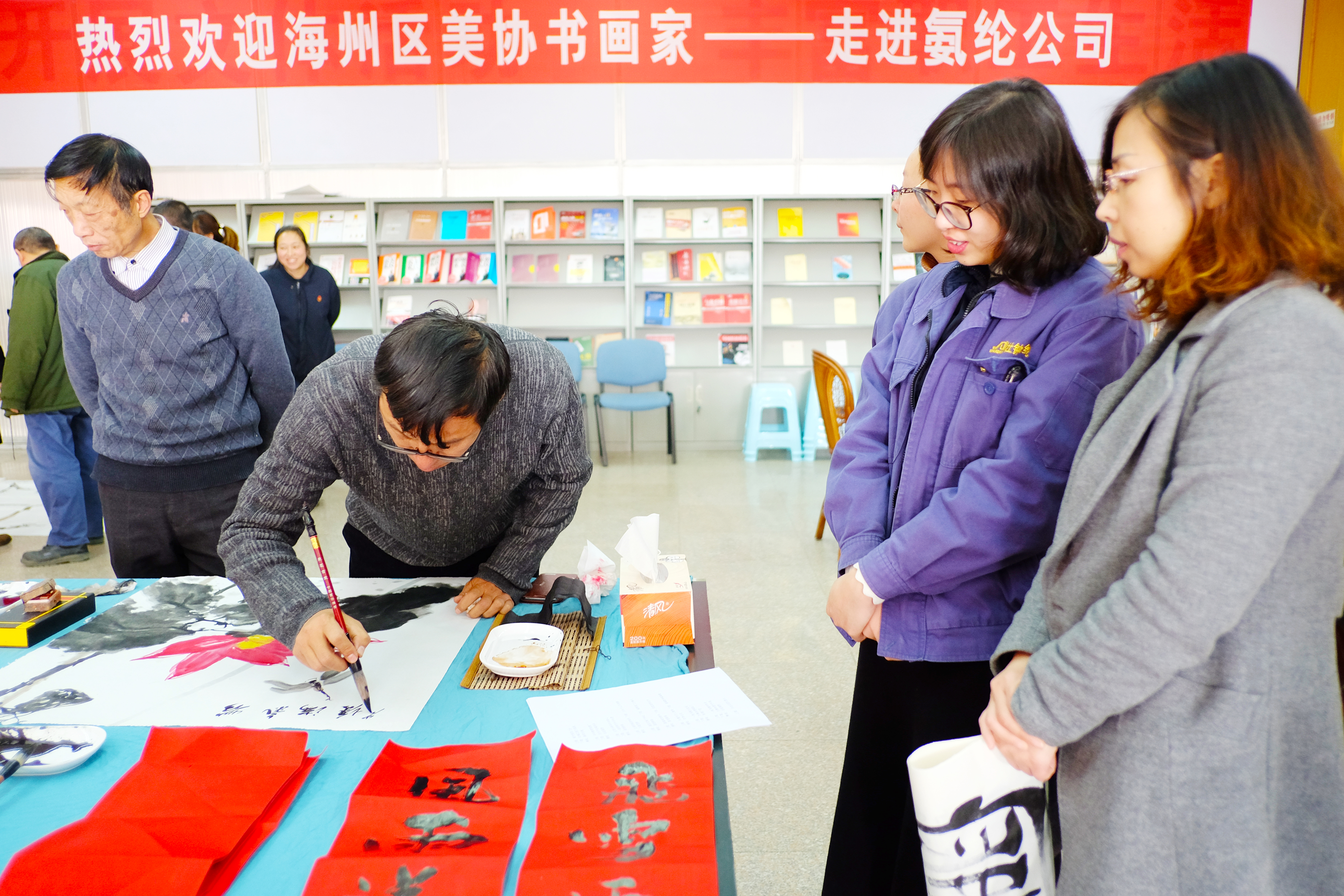 元旦、春節(jié)將至,為營造和諧喜慶的節(jié)日氣氛,不斷提升企業(yè)文化品位氛圍,12月30日,海州區(qū)美術(shù)協(xié)會7位書畫大師受邀赴我公司潑墨獻寶。我司幾位書法愛好者也同場競技學(xué)習(xí),豐富了員工的文化生活。