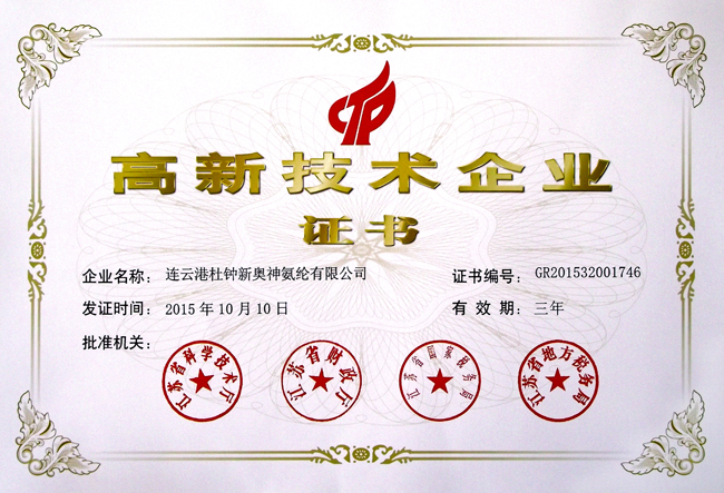 近期,氨綸公司收到由省科學(xué)技術(shù)廳、省財(cái)政廳、省國(guó)家稅務(wù)局和省地方稅務(wù)局聯(lián)合頒發(fā)的《高新技術(shù)企業(yè)證書(shū)》,此次榮獲高新技術(shù)企業(yè)證書(shū),是相關(guān)部門(mén)對(duì)杜鐘氨綸技術(shù)創(chuàng)新能力和技術(shù)研發(fā)能力的肯定,更預(yù)示著杜鐘氨綸創(chuàng)新技術(shù)已經(jīng)邁向更高臺(tái)階。