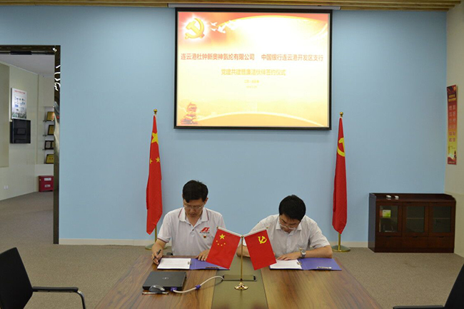 6月29日上午,杜鐘氨綸公司與中行連云港開發(fā)區(qū)支行舉行黨建共建及廉潔伙伴協(xié)議簽約儀式。儀式上,中行連云港開發(fā)區(qū)支行行長(zhǎng)介紹了分行的基本情況、經(jīng)營管理情況、黨建和黨風(fēng)廉政建設(shè)情況。
