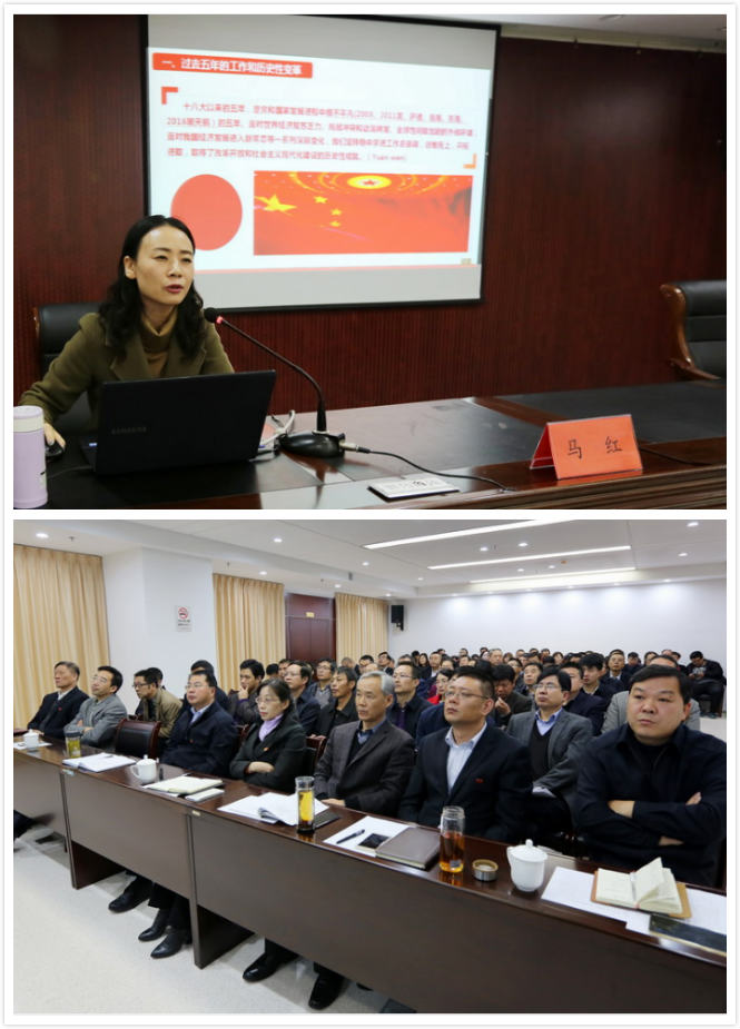 本場報告會邀請市委黨校沿海開發(fā)研究室副教授馬紅主講。馬紅教授以《不忘初心,牢記使命,為實現(xiàn)中華名族偉大復興的中國夢不懈奮斗!》為主題,從鮮明主題、歷史性變革、主要矛盾的深淵影響、兩個一百年奮斗目標、全面從嚴治黨等13個方面出發(fā),引用了古今中外大量案例,配合通俗的語言和生動的幻燈片,系統(tǒng)而詳實地向在座黨員介紹了“黨的十九大報告”精神與內(nèi)涵,并結(jié)合經(jīng)濟建設(shè)的相關(guān)內(nèi)容,給我公司的發(fā)展提出了寶貴意見。
