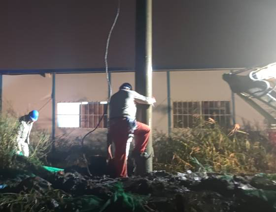 今年的10月天氣還是熱的厲害,電桿被太陽曬的滾燙,搶修人員臉上掛滿了豆大的汗珠,工作服已經全部濕透。為了搶時間,抓進度,作業(yè)人員們全然不顧,依然緊張有序地工作著?,F場搶修工作涉及吊車、挖掘機等大型施工機具,安全管控尤為重要,現場所有搶修人員在工作負責人的指揮下平穩(wěn)有序的推進搶修工作,吊車擺放位置、挖掘機挖桿洞的位置等每一個關鍵工作點都在搶修人員的嚴格監(jiān)督下進行,不敢有絲毫松懈。就在這時,天公不作美,突然下起了大雨,可是大雨并沒有攔住搶修工作。臺北供電所現場所有的搶修人員在錢所長的帶領下,穿著濕透的工作服在雨中指揮挖掘機開挖桿洞、組立電桿、連接導線-------搶修人員在天昏地暗的雨中穿梭,雨水和汗水交匯在電力搶修人員的臉龐上,大家都來不急擦拭一下臉上的雨水,在雨中忙碌著。經過4個半小時的緊張有序搶修,晚上19:30分10KV港北線恢復供電。