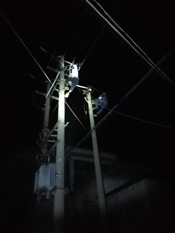 8月5日晚,接到報修電話的值班人員,帶好隨身工具立即到達黃沙一隊查看情況。借著手電發(fā)現(xiàn)一組引線已經(jīng)燒毀。正值天氣炎熱,為了保證居民正常用電,值班人員一邊安撫居民,一邊聯(lián)系值班領(lǐng)導說明情況。值班人員回到所里立即準備搶修材料,值班領(lǐng)導聯(lián)系家住在附近的員工前來支援搶修工作。經(jīng)過近一個半時的奮戰(zhàn),恢復了居民的用電。看見家家戶戶亮起了燈光,渾身濕透的搶修人員才舒了一口氣。( 盧正遷)