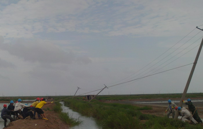 8月3日天剛亮,大家都顧不上休息,立即分片趕到受災(zāi)現(xiàn)場(chǎng)巡視情況。東港工區(qū)洋井口8根高壓桿被刮倒,大瑞頭圩、二圩、新灘口和方南、嚴(yán)港等工區(qū)30多根低壓桿被刮歪,有的倒在了格堰上,情況十分危急。搶修人員立即作了停電應(yīng)急處理,確保安全。
