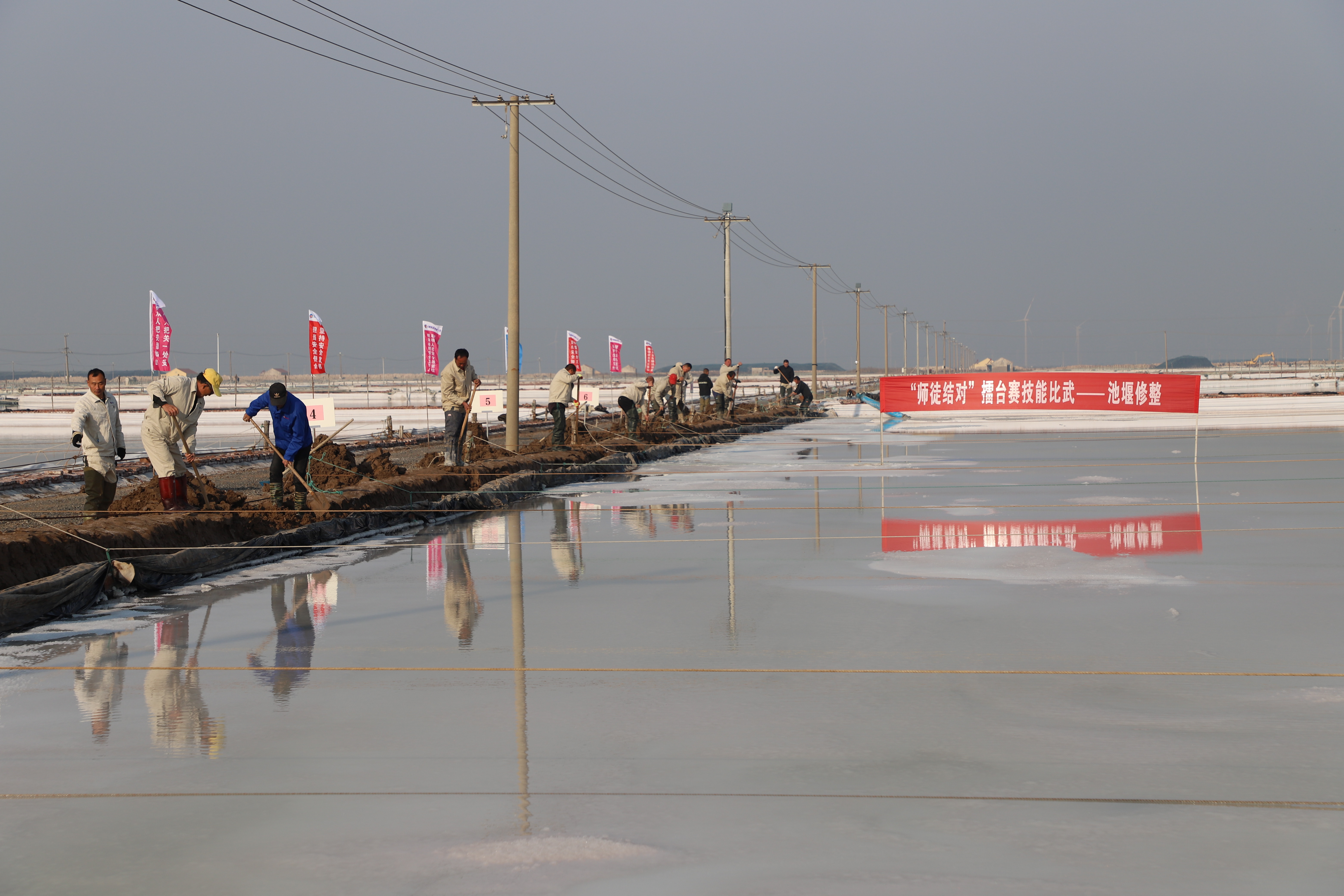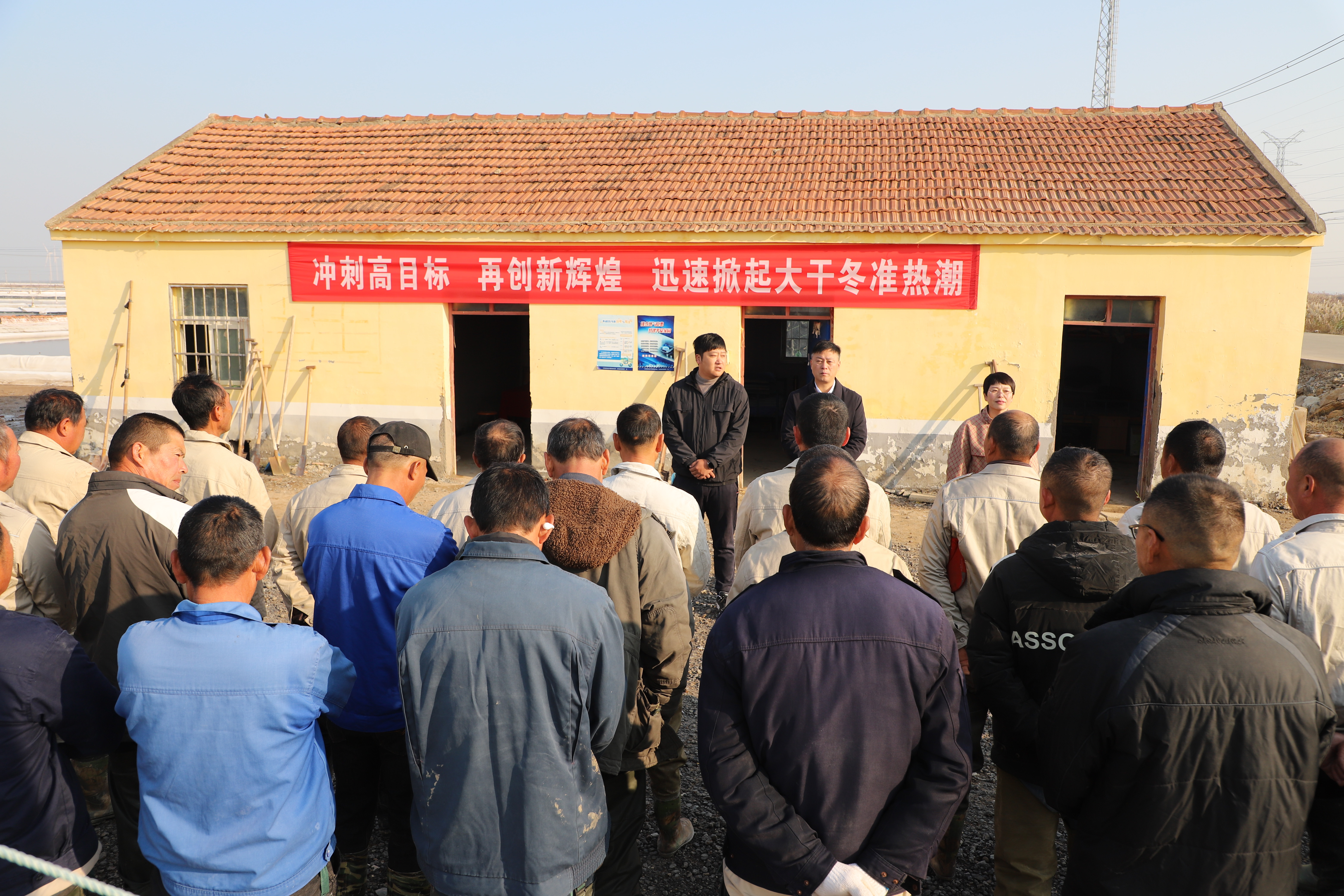 在新河制鹽分公司12班灘頭,常務(wù)副總經(jīng)理徐一林對冬準(zhǔn)工作提出要求,總經(jīng)理吳衛(wèi)平宣布“‘薪火灌筑 匠星西傳’師徒結(jié)對擂臺賽”正式開始!