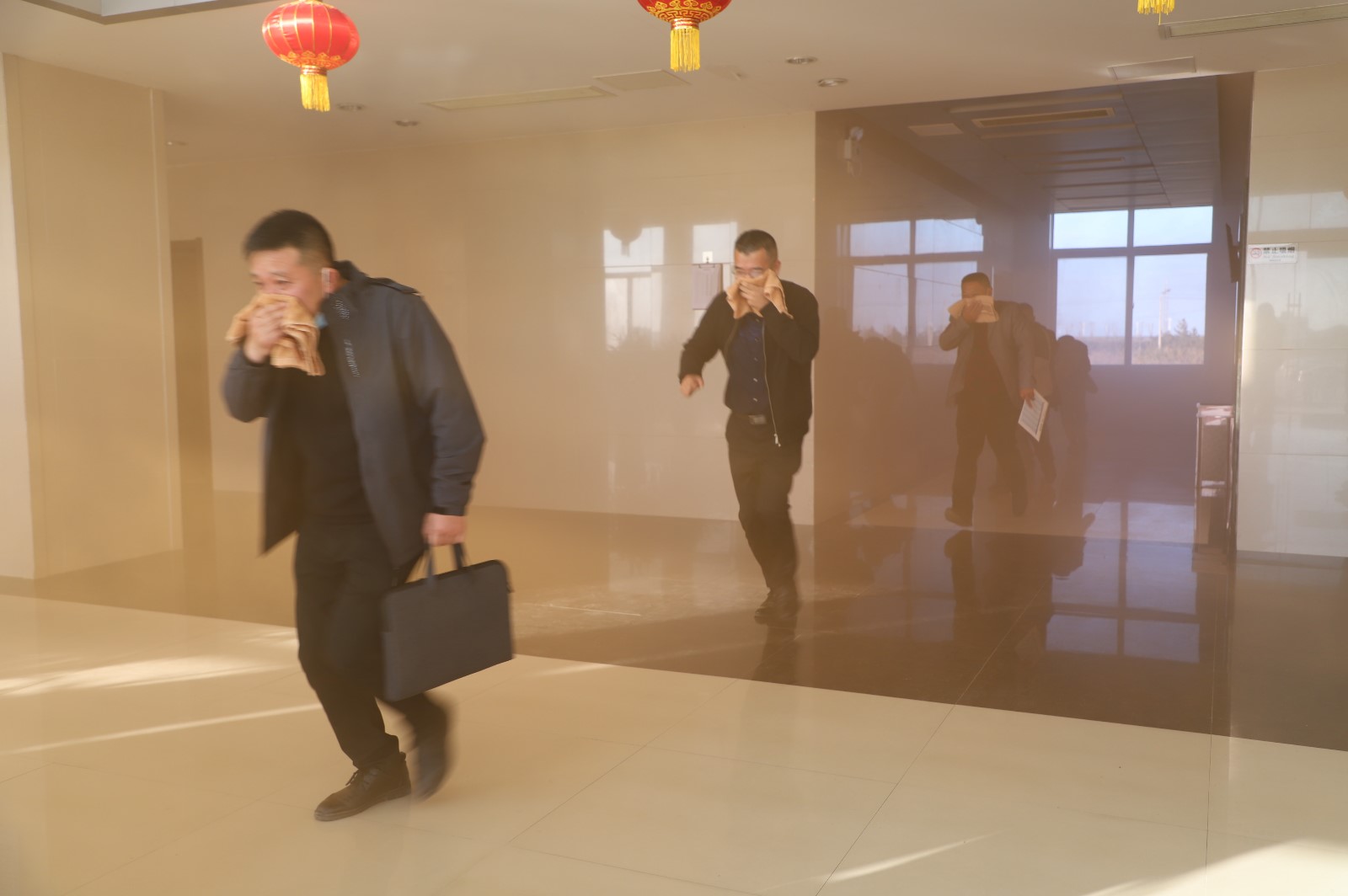 此次實(shí)戰(zhàn)演練的“突發(fā)事件”地點(diǎn)設(shè)在機(jī)關(guān)大樓,所有參訓(xùn)人員按照既定的消防應(yīng)急預(yù)案進(jìn)行了一次消防安全模擬演練。隨著“消防警報聲”響起,正在大樓內(nèi)工作的員工在濃煙中用濕巾捂嘴、彎腰、靠墻從樓梯道口迅速有序地疏散、撤離,在假定火災(zāi)發(fā)生條件下進(jìn)行逃生自救實(shí)戰(zhàn)演練。救援組、疏散組、后勤組各組成員各負(fù)其職,配合有序,隨后,大家在樓前廣場上進(jìn)行了滅火器實(shí)戰(zhàn)操作訓(xùn)練。