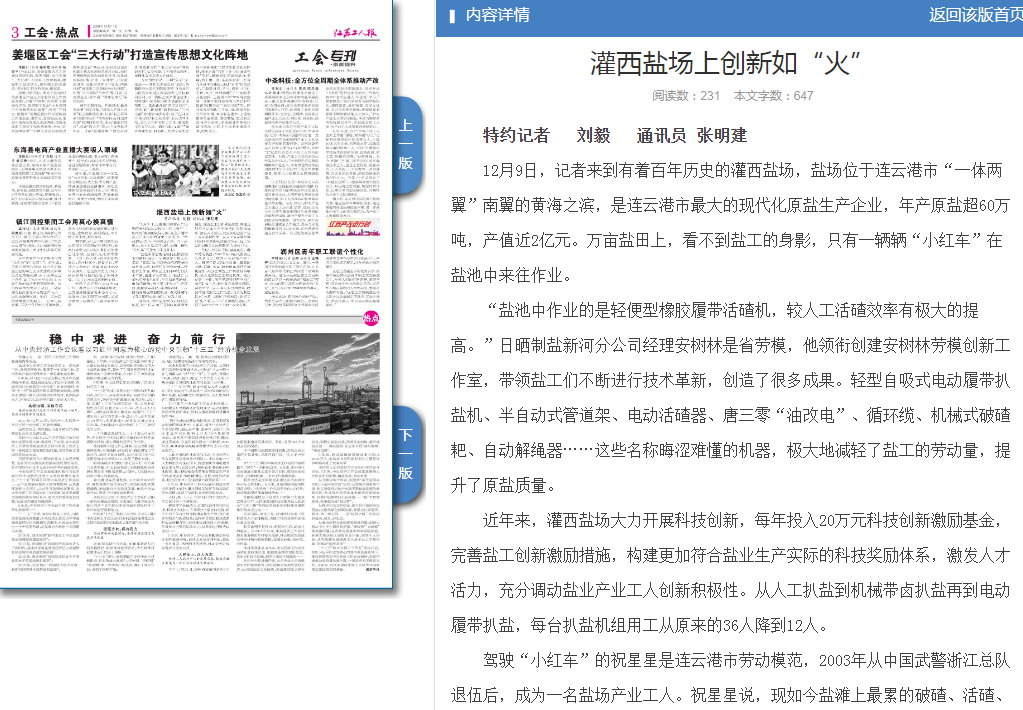 駕駛“小紅車”的祝星星是連云港市勞動(dòng)模范,2003年從中國武警浙江總隊(duì)退伍后,成為一名鹽場產(chǎn)業(yè)工人。祝星星說,現(xiàn)如今鹽灘上最累的破碴、活碴、扒鹽、收放塑布都是機(jī)械化操作,高強(qiáng)度制鹽工作都被機(jī)械取代,極大地減輕鹽工勞動(dòng)負(fù)荷。剛到鹽場工作時(shí),祝星星跟著師傅王新東學(xué)習(xí)制鹽工藝,長年累月地風(fēng)吹日曬,祝星星早已沒有當(dāng)年的白凈膚色,收獲的是成熟的工作經(jīng)驗(yàn),成長為制鹽技術(shù)“大拿”,創(chuàng)新“傳統(tǒng)海鹽+新式工藝”生產(chǎn)模式、“216”式單池加鹵法,實(shí)現(xiàn)了鹽業(yè)生產(chǎn)技藝上的一次次變革。(特約記者 劉毅 通訊員 張明建)