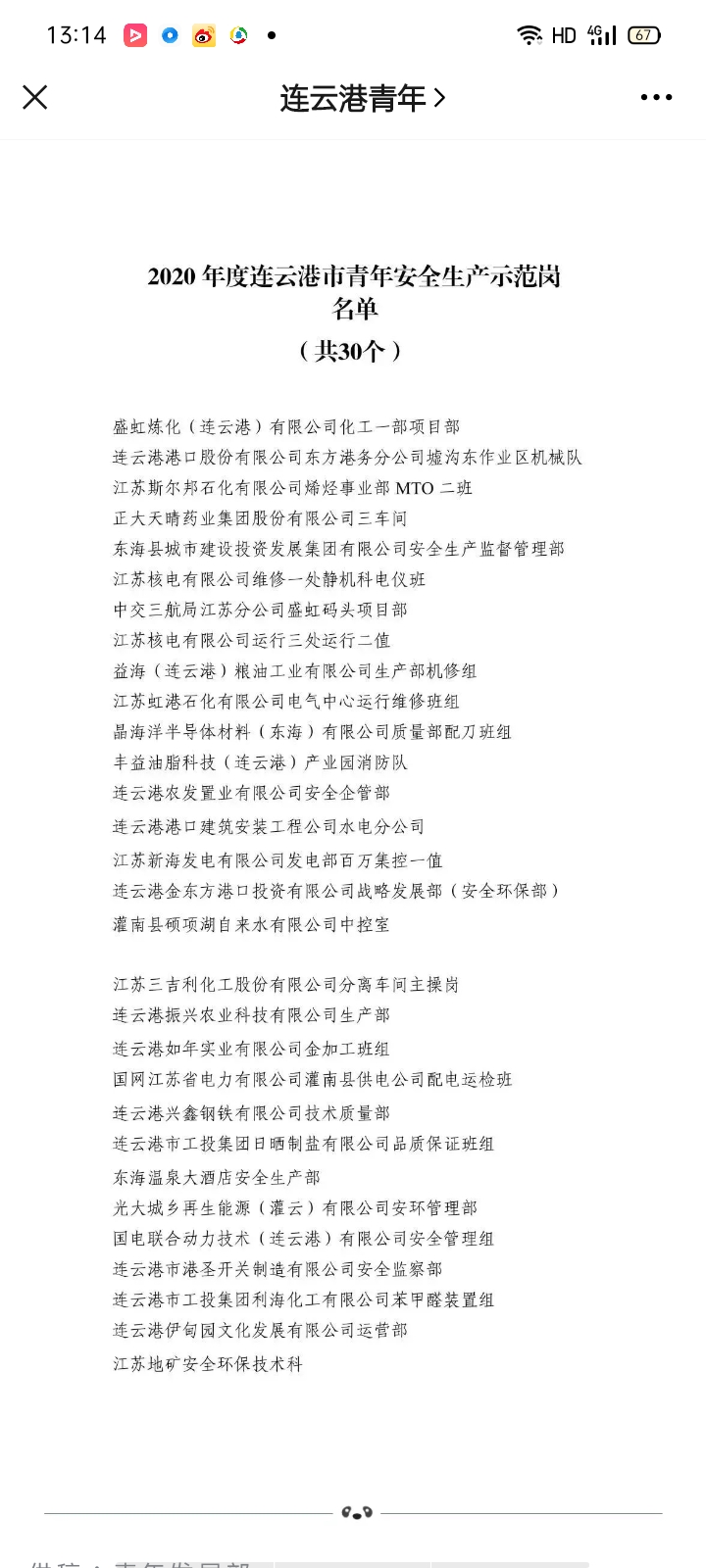 11月12日,共青團連云港市委員會公布2020年度連云港市青年安全生產(chǎn)示范崗名單,連云港市工投集團日曬制鹽公司品質(zhì)保證班組被評為2020年度連云港市青年安全生產(chǎn)示范崗。