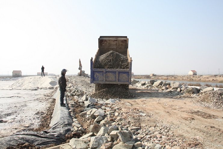 2月15日,在新河制鹽公司七至十班運(yùn)鹽路施工現(xiàn)場,我們看到南翼公司項(xiàng)目工程分公司的員工正在指揮兩臺小型工程車將石子傾倒在路基上,兩臺挖掘機(jī)正忙于將運(yùn)送來的石子整平。運(yùn)鹽河對面,三輛滿載土夾石的大型工程車一字排開,正等待卸載。據(jù)了解,目前正在施工的是新河制鹽分公司二期運(yùn)鹽路維修改造工程,該工程改造路段全長3300米,計劃總投資193萬元,其中路基鋪設(shè)部分由日曬制鹽公司出資45萬元,路面部分則由縣交通局承擔(dān),預(yù)計需要投入148萬元。該工程于去年底開始施工,預(yù)計三月中下旬全部鋪設(shè)完成。另外新河制鹽分公司一期一至十二班3300米運(yùn)鹽路改造工程計劃將于今年下半年實(shí)施。