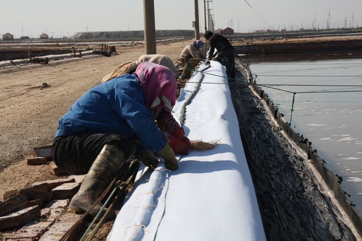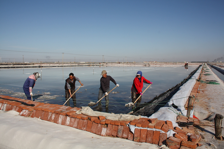 3月14日下午,風(fēng)和日麗,在日曬制鹽公司廣闊的結(jié)晶生產(chǎn)區(qū),潔白的鹽廩、潔白的格堰在陽(yáng)光照耀下,顯得格處醒目,只見工人們有的在扒鹽,有的在破碴,還有的在更換塑布......全公司上下一派大干場(chǎng)景。我們?cè)谛潞又汽}分公司的八班一期生產(chǎn)區(qū),只見工人們兩人一組,蹲在池堰邊,用土工布固化格堰,進(jìn)行灘場(chǎng)亮化,這一片區(qū)域是公司正在建設(shè)的食用原料海鹽生產(chǎn)基地。在一期與二期間的生產(chǎn)路上,我們遇到了該公司經(jīng)理安樹林,他正從南邊班組一路檢查走來(lái),他告訴我們,自公司職代會(huì)召開過(guò)后,新河制鹽分公司通過(guò)支委會(huì)、班組會(huì)迅速傳達(dá)公司職代會(huì)精神,貫徹落實(shí)班組承包方案,對(duì)照全年產(chǎn)鹽55萬(wàn)噸的目標(biāo),做好任務(wù)分解。當(dāng)前鹽業(yè)生產(chǎn)積極做好破碴、活碴、更新塑布等工作,全力推進(jìn)扒鹽工作,今年以來(lái)已經(jīng)扒鹽3.6萬(wàn)噸。