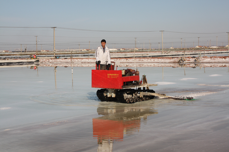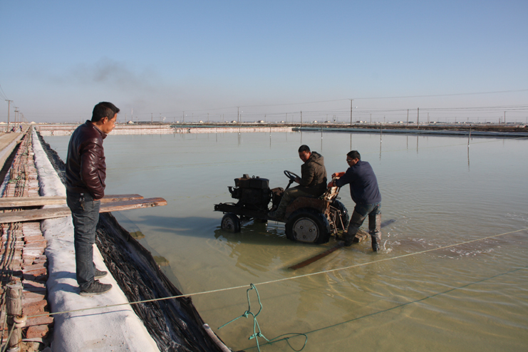 在埒南制鹽分公司的八班,我們看到一名工人正熟練操作著一臺(tái)整平機(jī)械在結(jié)晶池內(nèi)來(lái)回移動(dòng),對(duì)扒過(guò)鹽的格塊進(jìn)行整平,還有幾名工人用鐵锨整平機(jī)械到不了的邊角地帶。由于在廩基上沒有看到鹽,而結(jié)晶池已扒過(guò)鹽,我們覺得奇怪,經(jīng)了解,原來(lái)今年新扒鹽已經(jīng)有部分銷售了出去。埒南制鹽分公司經(jīng)理?xiàng)钍乇诰虐嗟臑┥喜榭礄C(jī)械破碴情況,他說(shuō)道:“我們以委員包片形式深入班組貫徹公司職代會(huì)精神,加強(qiáng)形勢(shì)任務(wù)宣傳統(tǒng)一思想,讓員工認(rèn)識(shí)到當(dāng)前原鹽市場(chǎng)回暖行情,鼓舞士氣,振奮精神,全力投入到當(dāng)前春季生產(chǎn)中來(lái)。”