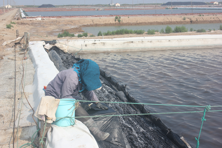 我們首先來到新河制鹽分公司十二班,映入我眼簾的是一位女工頭頂烈日坐在灘頭認(rèn)真修補(bǔ)塑料布,她用毛巾將破損地方擦拭干凈,待水漬干透,涂抹上膠水,再將一塊新的布粘貼上去,技藝十分嫻熟。