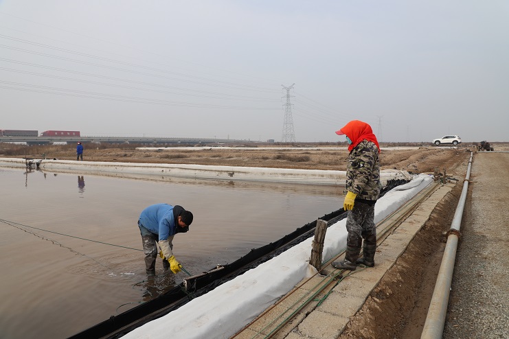 在日曬制鹽新河分公司零班生產(chǎn)現(xiàn)場,該班全體員工正在班長王興東的帶領(lǐng)下有條不紊的忙碌著,他們有的在對繩、有的在活碴、有的在破碴。據(jù)了解,由于近期夜間氣溫仍然較低,導致鹽池內(nèi)的原鹽結(jié)塊現(xiàn)象較為嚴重,且對原鹽質(zhì)量有較大影響,因此原本于25日開始的扒鹽工作現(xiàn)在已經(jīng)全部暫停,待氣溫進一步升高再繼續(xù)扒鹽工作。