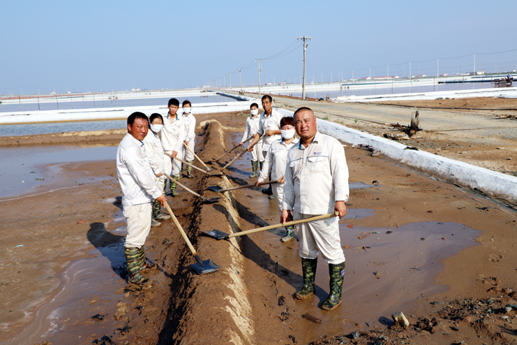 趁著休息的間隙,筆者與身邊忙得滿頭大汗的8班班長祝星星聊了起來。據祝星星介紹,每天員工4點半就到灘頭,進行鹽池的人工活碴、稟基修復、鹽池鹵水補充、收放設備檢查等一系列工作,因此,合理安排工作量非常重要。他告訴筆者,室外工作工人的勞保服比較厚,一天下來工作服濕了又干,干了又濕,衣服上都泛出厚厚的鹽漬。一天下來,全班要消耗2大桶甚至更多的飲用水。現(xiàn)在公司里對我們一線生產崗位員工非常關心,防暑降溫工作非常到位。最近,單位又為我們發(fā)放高溫津貼、電風扇、防暑降溫藥品。這些讓我們員工真切感受到組織的力量,組織得偉大,所以雖說現(xiàn)在比平時更辛苦,我們有信心戰(zhàn)高溫、奪高產。