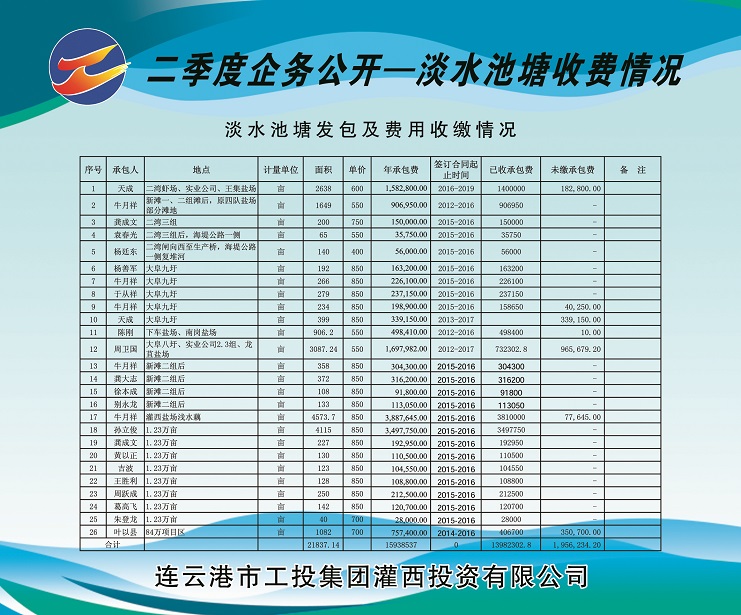 1、淡水養(yǎng)殖池塘發(fā)包及費(fèi)用收繳情況。共發(fā)包淡水養(yǎng)殖池塘面積21837.14畝,應(yīng)收租賃費(fèi)1593.8537萬元,已收租賃費(fèi)1398.23028萬元,欠收租賃費(fèi)195.62342萬元,收繳率為88%。