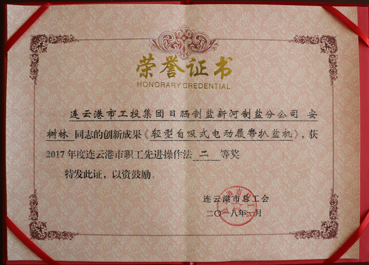 近日,日曬制鹽新河制鹽分公司安樹林同志的創(chuàng)新成果《輕型自吸式電動(dòng)履帶扒鹽機(jī)》,被市總工會(huì)評(píng)為2017年度連云港市職工先進(jìn)操作法二等獎(jiǎng),日曬制鹽公司機(jī)電服務(wù)公司王緒華同志的創(chuàng)新成果《唐三零柴油機(jī)傳動(dòng)改為電動(dòng)機(jī)傳動(dòng)帶鹵扒鹽機(jī)組》,被市總工會(huì)評(píng)為2017年度連云港市職工先進(jìn)操作法三等獎(jiǎng)。(西工)