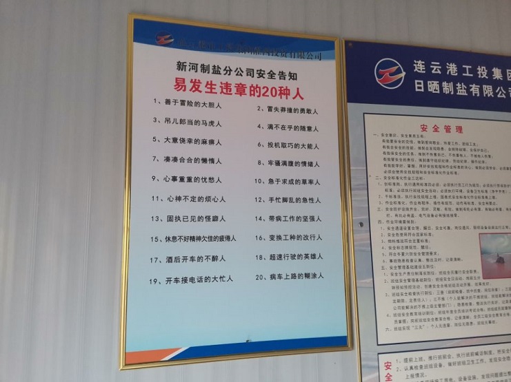 4月25日,新河制鹽分公司對16個產(chǎn)鹽班組安全活動室加裝安全告知牌,這是該公司防范人為因素造成安全事故,確保安全生產(chǎn)形勢穩(wěn)定采取的措施之一。