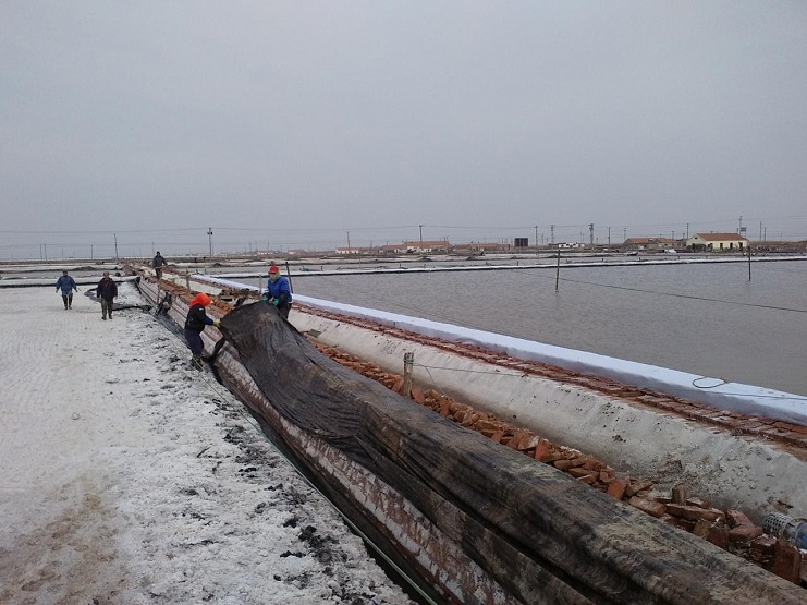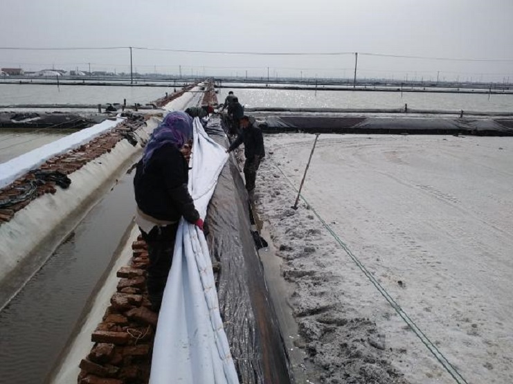 新河制鹽分公司為了盡快改善食用鹽基地面貌,減少池埝上固化紅磚風化,沙塵落入鹽池內(nèi),對池鹽的污染,近期組織分公司職工,對基地塑池的紅磚固化池埝進行處理,先用黑塑布把池埝重包一遍,然后再用土工布苫好。有效地減少了雜物落入池鹽中,為產(chǎn)合格食用鹽提供了良好生產(chǎn)環(huán)境。(圖為職工們正在苫蓋紅磚固化池埝。) (唐廣付)