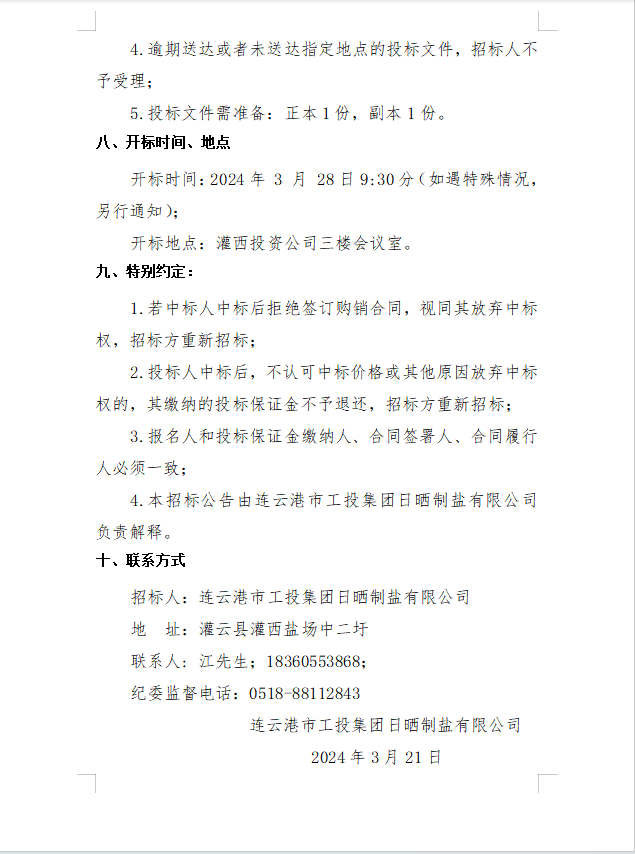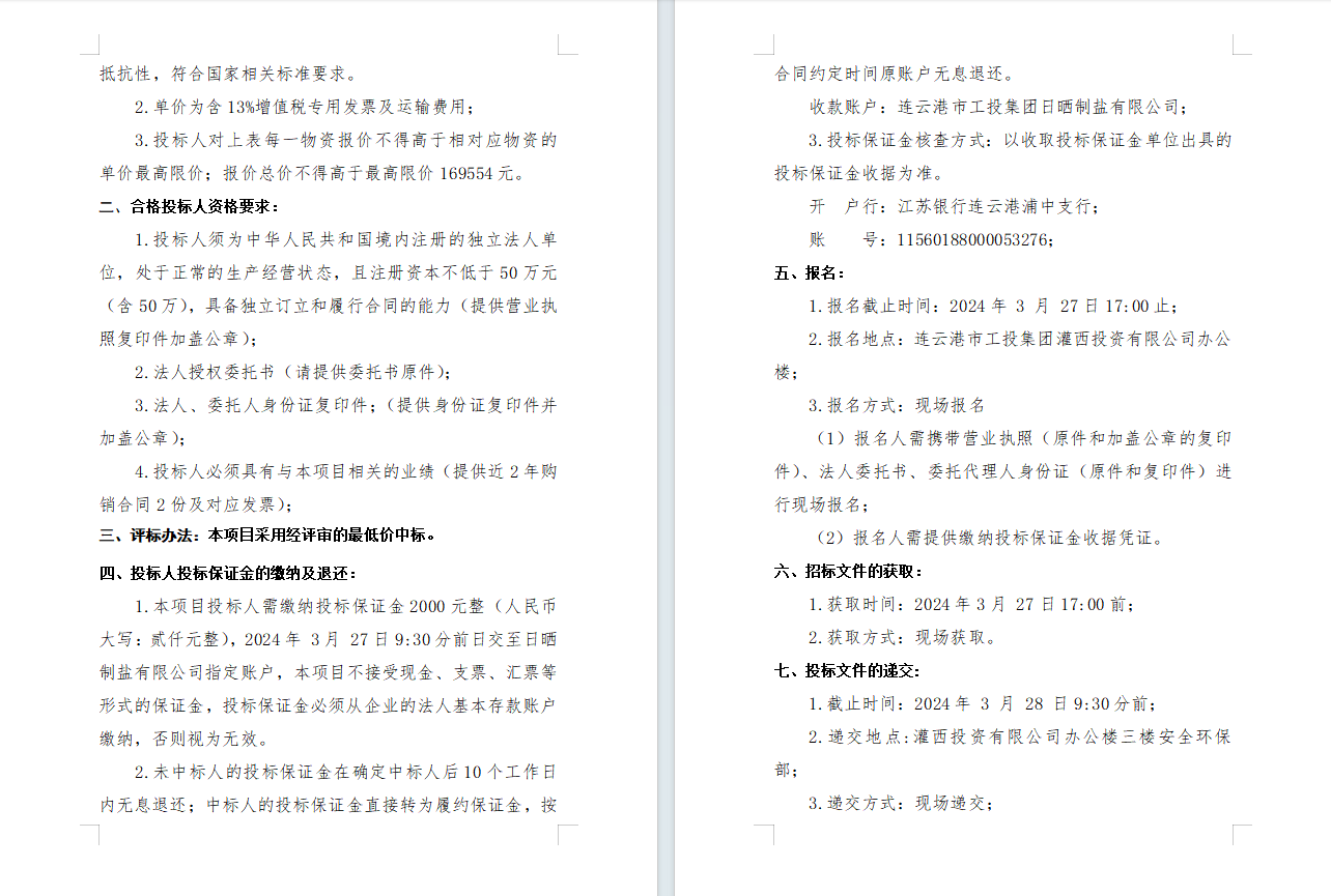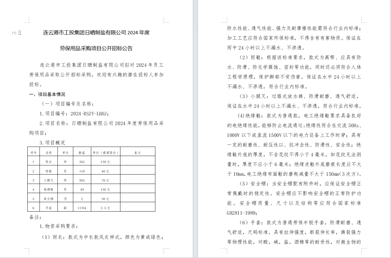 連云港市工投集團(tuán)日曬制鹽有限公司2024年度勞保用品采購項目公開招標(biāo)公告