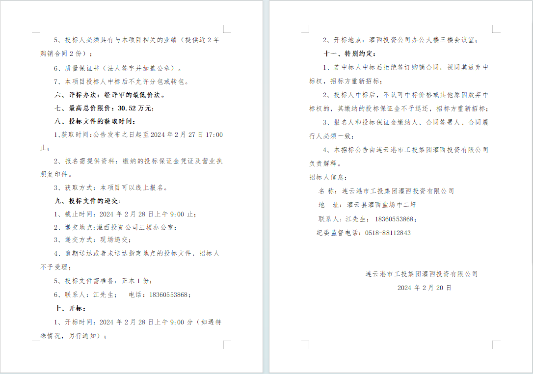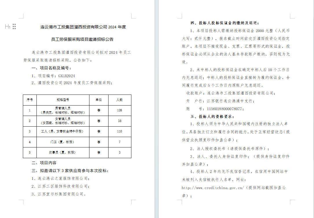 連云港市工投集團(tuán)灌西投資有限公司2024年度員工勞保服采購(gòu)項(xiàng)目邀請(qǐng)招標(biāo)公告